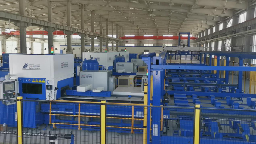 通過在庫房至激光加工車間之間建立一條自動傳輸線,實現成捆原材料及成品往返傳輸,實現了自動接收、智能分配、調度任務,柔性加工生產,高速高精、安全穩定運行、高質量智能加工。該產線由中央調度系統自動分配任務,三臺全自動激光切管機對指派的任務實現全自動上料、下料及激光加工;自動分揀系統對加工彈架進行自動分揀、計數,到達指定數量后,全自動搬運系統進行自動搬運至內壁處理系統;內壁自動處理系統對彈架進行自動分料、上料、內壁拋光、自動下料,完成拋光的彈架通過RGV傳輸線轉運至焊接、裝配車間進行焊接、裝配、打包,彈架成品經RGV傳輸線返回庫房;生產線配以封閉安全防護系統及聲光報警系統。
