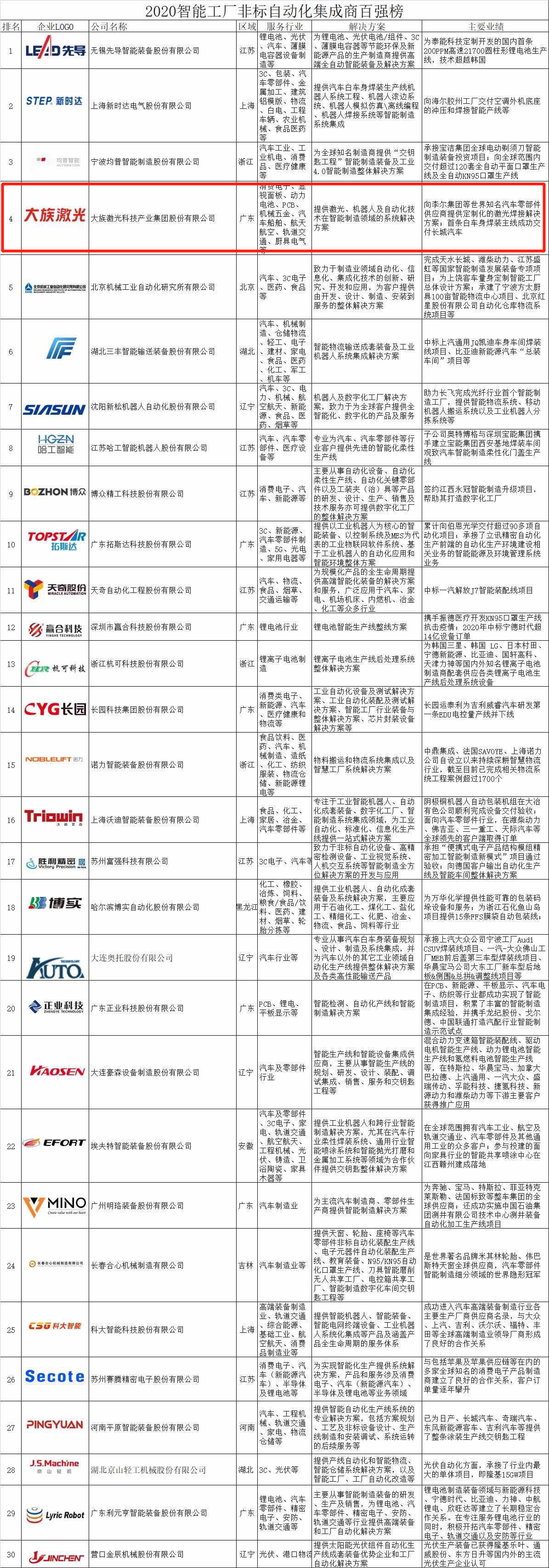 大族激光上榜《2020中國智能工廠非標自動化集成商百強榜》!