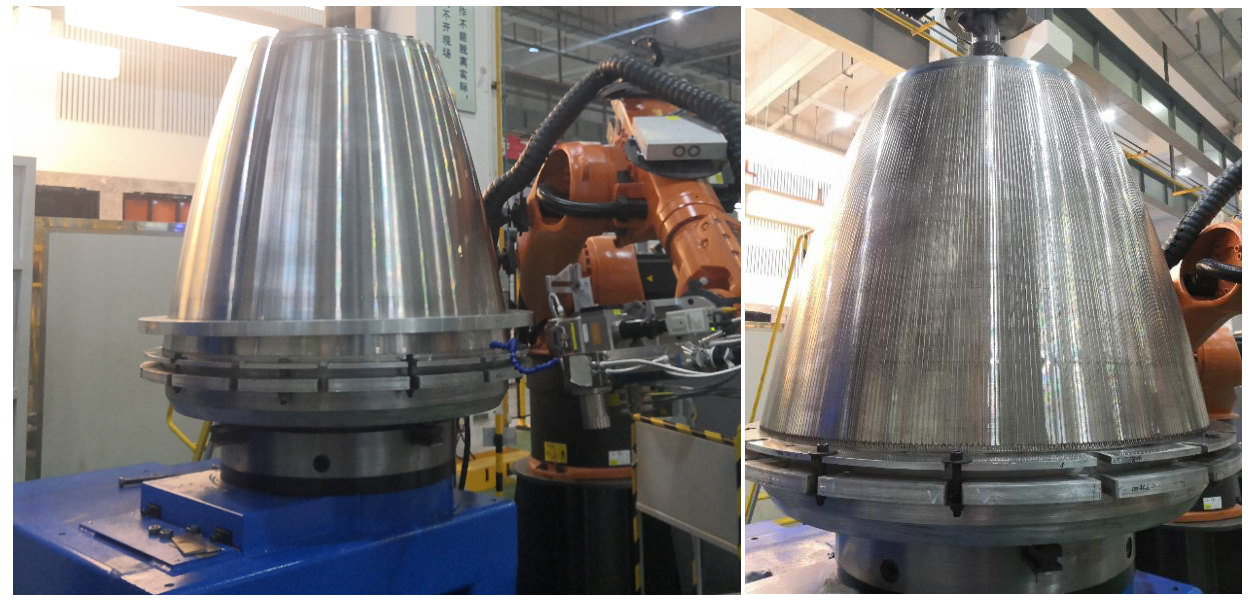 RK1Z激光焊接系統是大族智能裝備集團高功率焊接中心為大型火箭發動機等立式回轉體激光焊接而開發的成套設備。整套設備最大焊接功率8000W,最大可焊深度10mm,最大可焊直徑接近2m,可滿足客戶未來二級發動機、上面級發動機大面積比噴管焊接需求。經過大量的工藝探索已經成功實現了GH4169&鎳、鉻鋯銅&1Cr18Ni9Ti等異種金屬大型薄壁件的焊接。采用上述焊接工藝及裝備,焊縫質量能滿足客戶需求的同時大大縮短了產品交期,極大降低了生產成本及對高水平焊接工人的依賴。