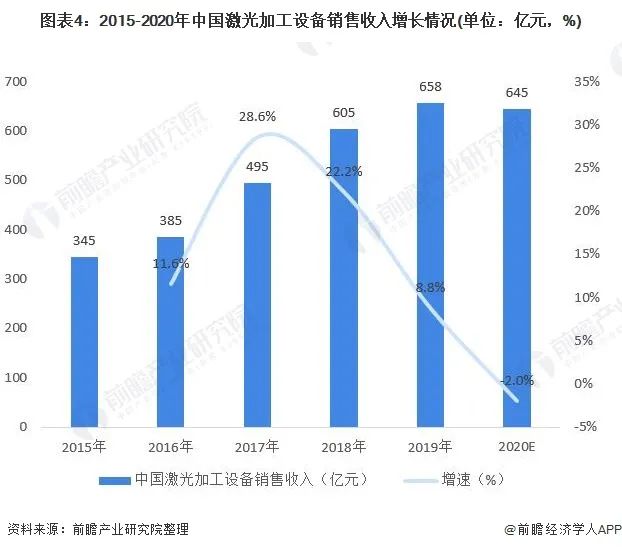 中國激光加工設(shè)備銷售收入約為全球的一半,2015-2020年中國激光加工設(shè)備銷售收入持續(xù)增長,2019年達(dá)658億元,2020年初步估計達(dá)到645億元。