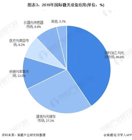 國際激光設(shè)備應(yīng)用較為多元化,包括材料加工與光刻市場、通信與光儲存市場、科研與軍事市場、醫(yī)療與美容市場、儀器與傳感器市場等,其中,材料加工與光刻市場占比最高,達(dá)40.6%;其次為通信與光儲存市場,占比為27.1%。