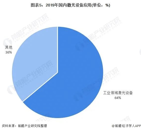 相對于全球激光設(shè)備應(yīng)用領(lǐng)域,國內(nèi)激光設(shè)別應(yīng)用較為單一與集中,64%的比重應(yīng)用于工業(yè)領(lǐng)域。