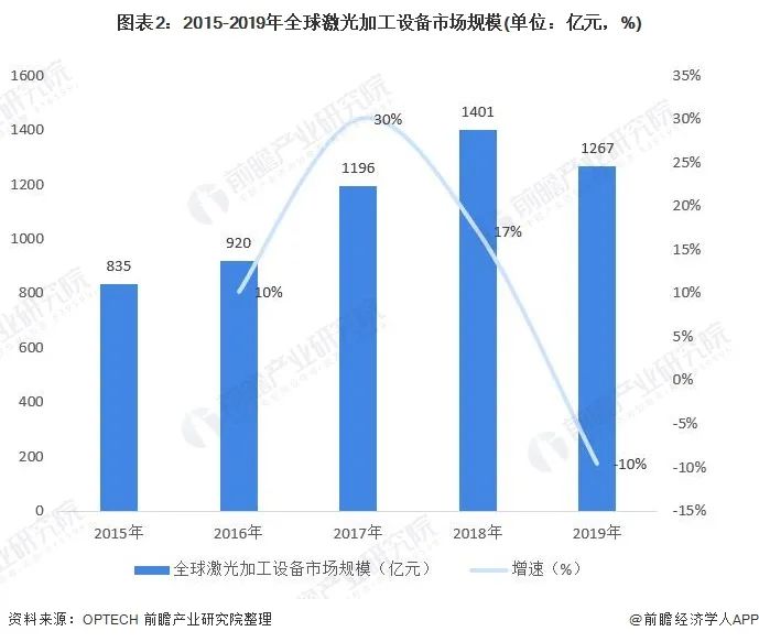全球激光加工設(shè)備市場規(guī)模超過千億元,2019年達(dá)到1267億元,同比下降10%。