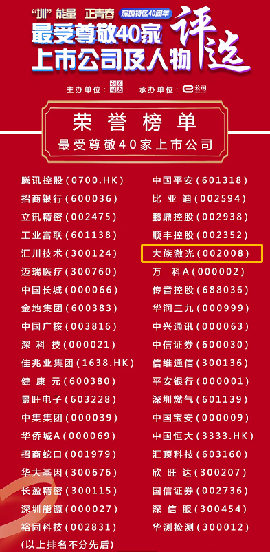 致敬深圳特區40周年!大族激光獲評深圳“最受尊敬40家上市公司”