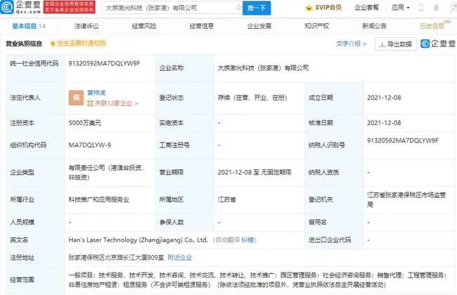 大族激光科技(張家港)有限公司成立于2021年12月8日,法定代表人為黃祥虎,注冊資本為5000萬美元,經營范圍包括技術服務、技術開發、技術咨詢、技術交流、技術轉讓、技術推廣;園區管理服務等。該公司股東包括大族激光科技股份有限公司、大族激光。
