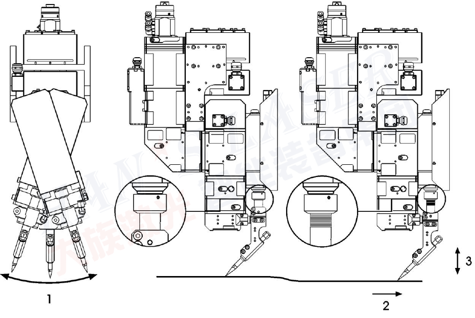激光從激光器發(fā)出,經(jīng)光纖傳導(dǎo)后被光纖耦合器耦合,自動(dòng)對(duì)焦模塊將發(fā)散的光束進(jìn)行準(zhǔn)直后轉(zhuǎn)換為平行光束,準(zhǔn)直后的平行光束經(jīng)過反射模塊的兩次反射后由光學(xué)聚焦模塊聚焦后到達(dá)工作面,整個(gè)焊接過程可以通過監(jiān)控模塊進(jìn)行全程監(jiān)控,縱向伸縮臂TA通過自動(dòng)控制模塊STRG與自動(dòng)對(duì)焦模塊關(guān)聯(lián),實(shí)現(xiàn)自動(dòng)對(duì)焦,安裝在伸縮臂上的壓力傳感器KS通過STRG與旋轉(zhuǎn)動(dòng)作控制模塊關(guān)聯(lián),實(shí)現(xiàn)焊縫跟蹤。