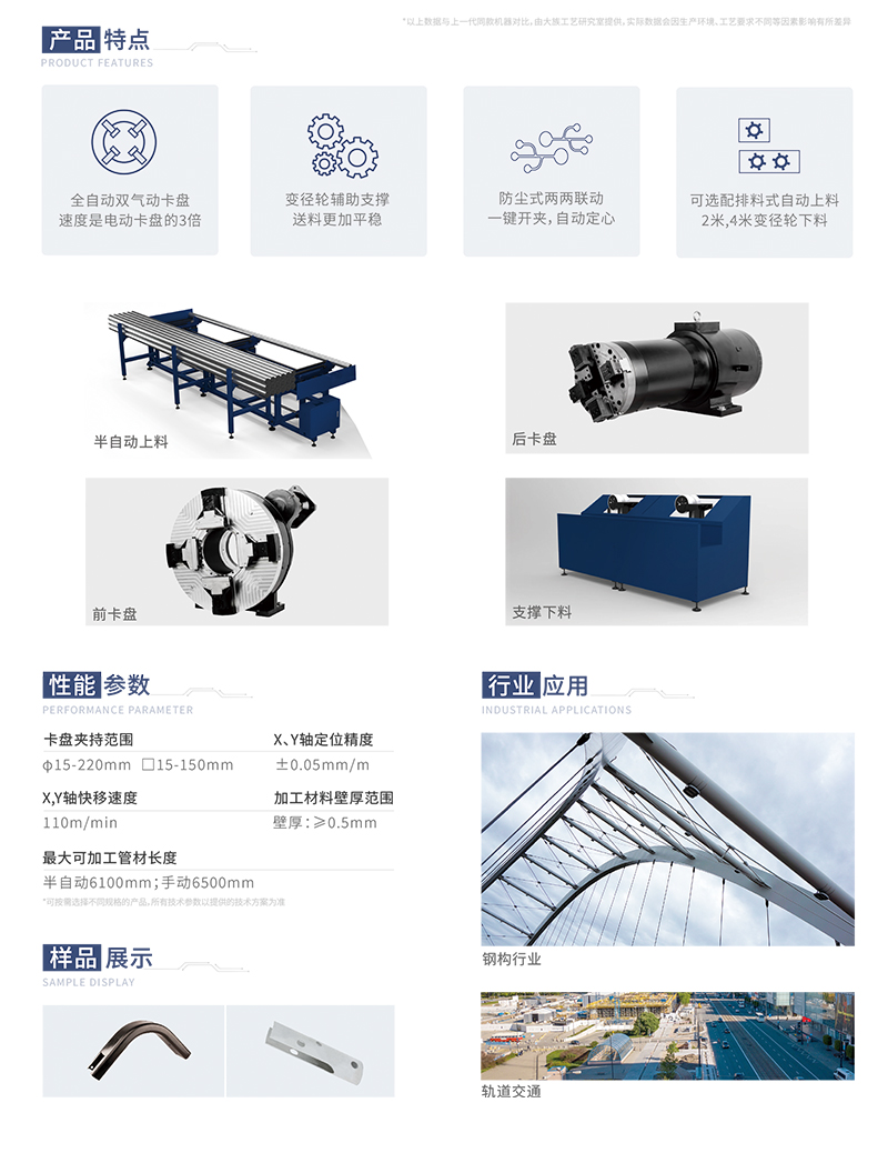 搭載全自動雙啟動卡盤,速度更快,配備變徑輪輔助支撐,送料更加平穩(wěn)。可選配排料式自動上料、1組或2組變徑輪下料,生產(chǎn)更便捷。